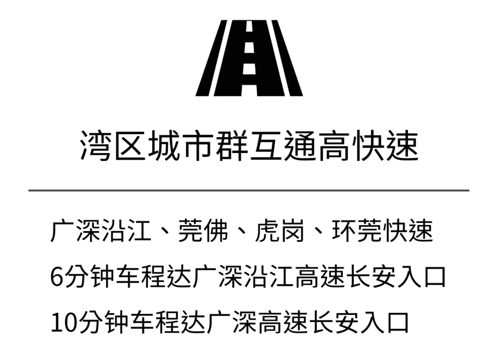长安地理位置优越,位于粤港澳大湾区黄金内湾几何中心、广深港澳科技创新走廊重要节点,大湾区「100公里黄金内湾」与东莞「黄金三角」在此交汇。长安西连广州南沙自贸区,东临深圳前海自贸区,机场、高速、高铁、快速干道等多轨道交通串联,30分钟到达粤港澳大湾区核心城市,商务出行、员工通勤、货物运输十分便捷。